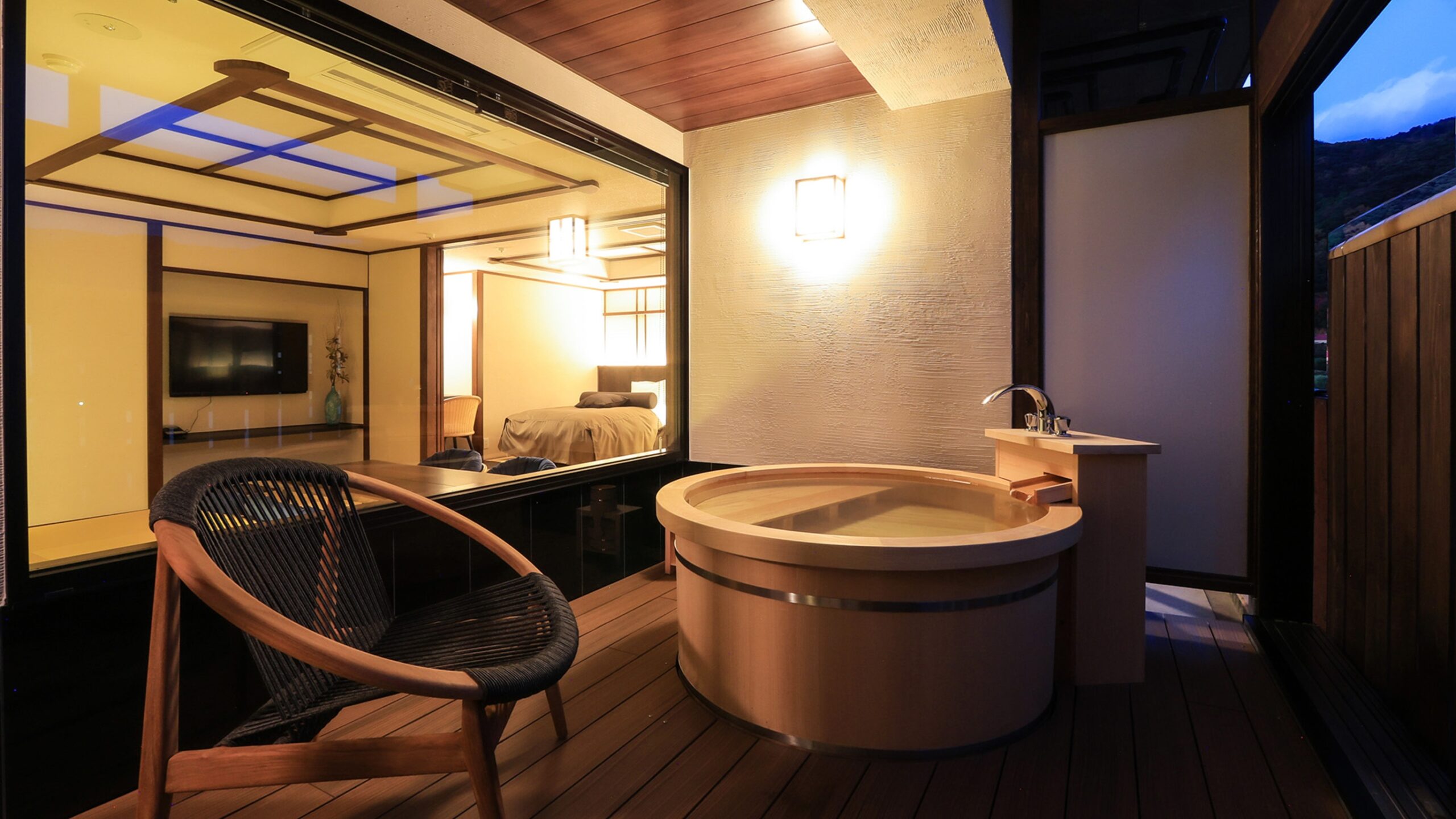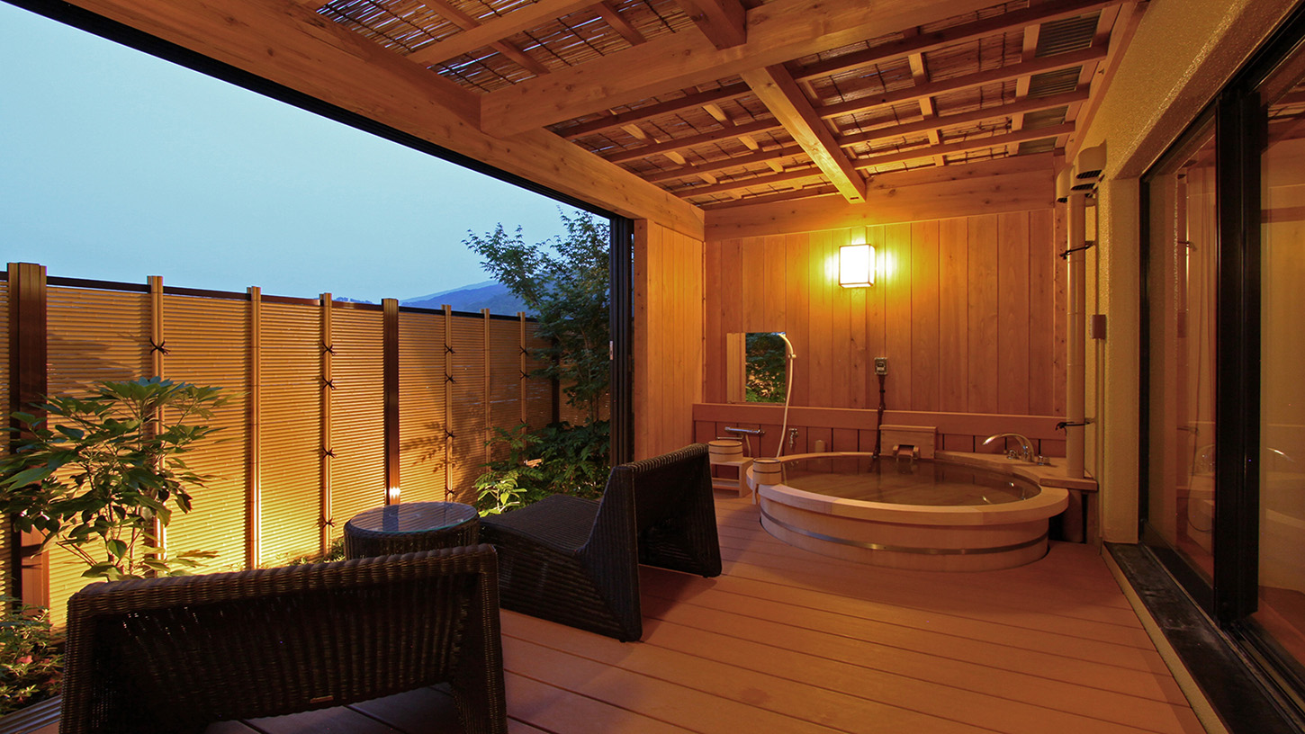 土肥ふじやホテルの露天風呂付客室の専用露天風呂は全て源泉100%掛け流し。