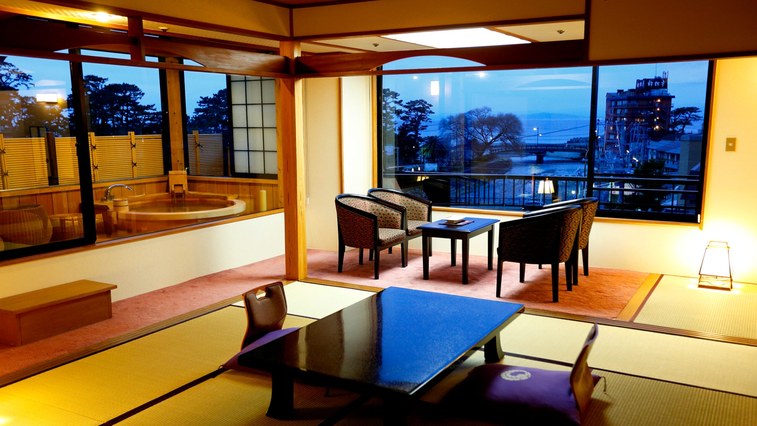 専有面積120平米超、駿河湾を望む大きな樽露天を設えた贅沢な一室