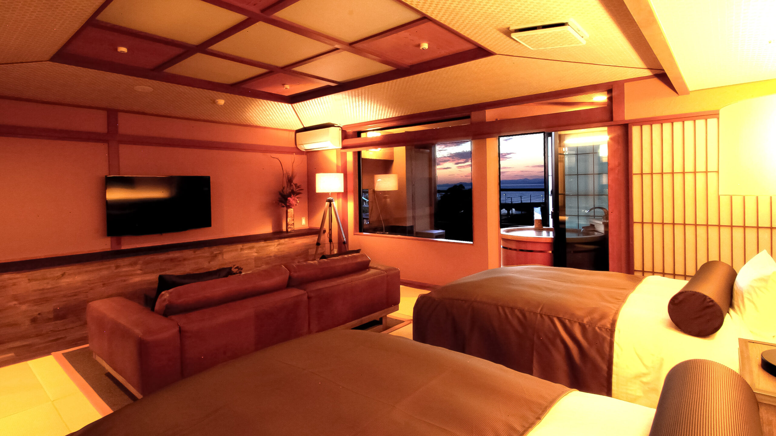 専有面積120平米超、駿河湾を望む大きな樽露天を設えた贅沢な一室