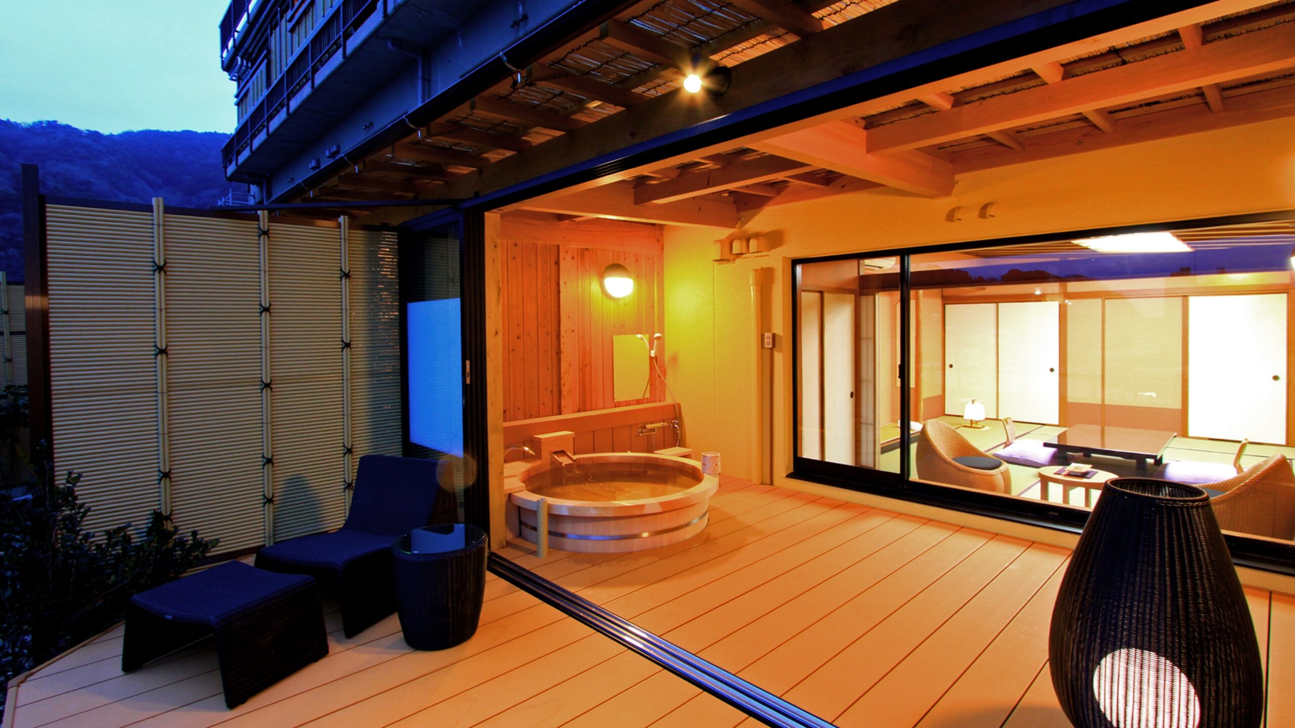 専有面積120平米超、駿河湾を望む大きな樽露天を設えた贅沢な一室