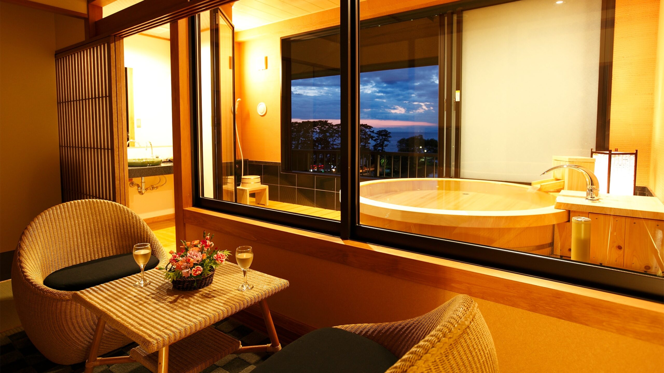 専有面積120平米超、駿河湾を望む大きな樽露天を設えた贅沢な一室